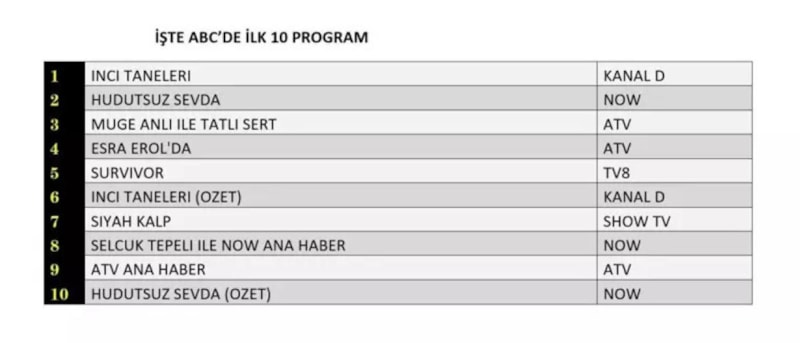 Her gün bir önceki güne ait Total, AB ve ABC sıralaması belli olurken dünün reyting sonuçları merakla bekleniyor.