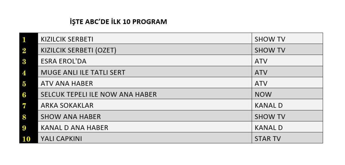ABC grubunda yine "Kızılcık Şerbeti" hem yeni bölümüyle hem de özetiyle ilk iki sırayı aldı. 3. sırada ise "Esra Erol’da" programı yer aldı.