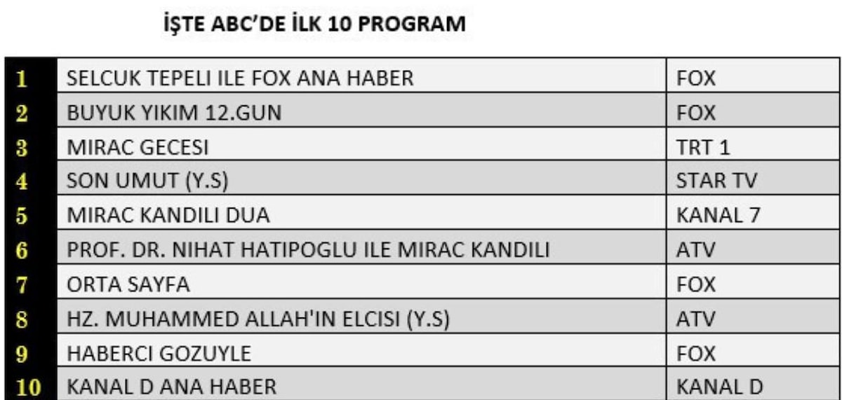 ABC'DE İLK 10 PROGRAM