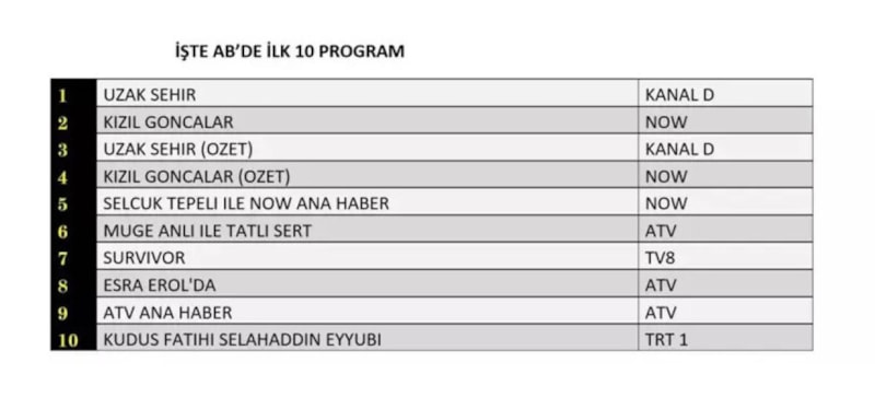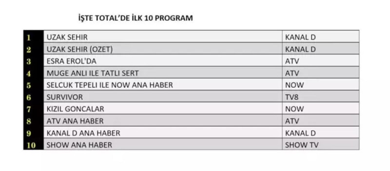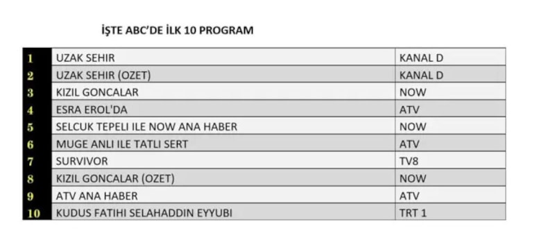 Kanal D’nin sevilen dizisi Uzak Şehir, üç kategoride de zirvede yer aldı. Now TV’nin Kızıl Goncalar dizisi ise AB ve ABC kategorilerinde üst sıralarda yer buldu.