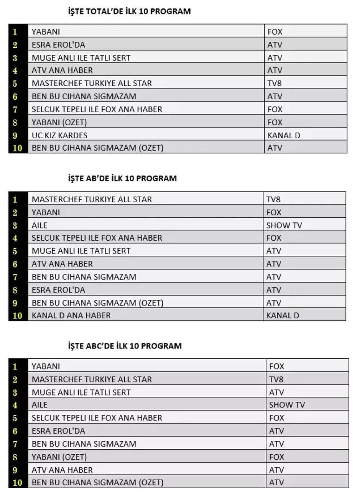 Her gün bir önceki güne ait Total, AB ve ABC sıralaması belli olurken dünün reyting sonuçları merakla bekleniyor.