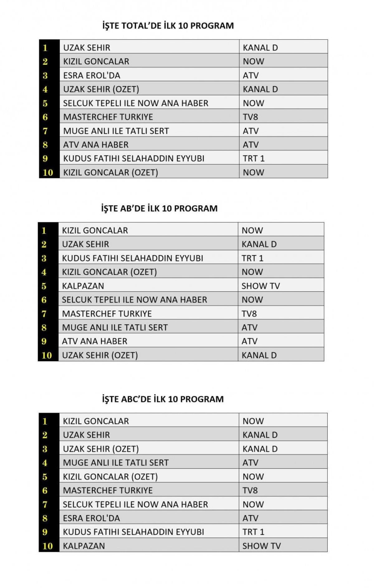 Total katagorisinde “Uzak Şehir”, Total reyting grubunda zirveye yerleşti. 2 sırada iddialı yapımlardan “Kızıl Goncalar” yer aldı. Gündüz kuşağının sevilen programı “Esra Erol’da” üçüncülüğü aldı.