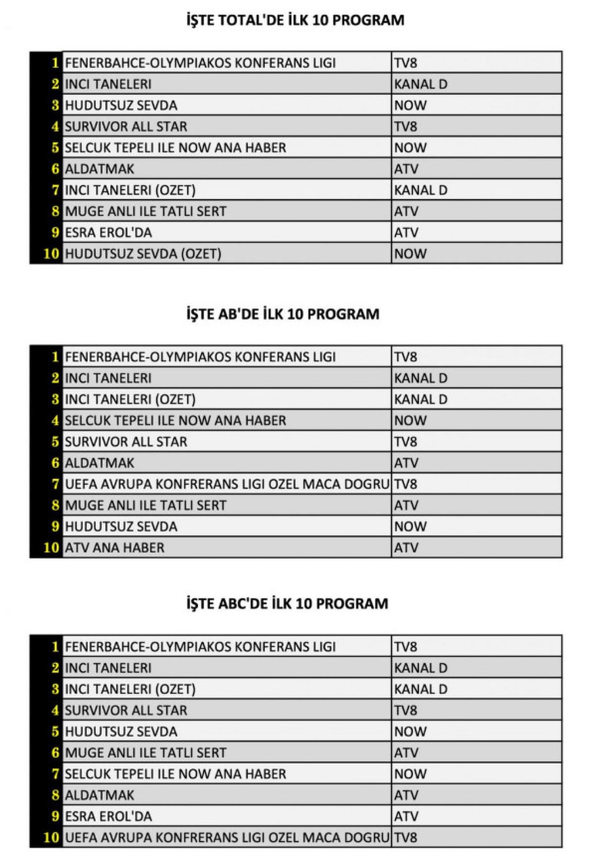 Her gün bir önceki güne ait Total, AB ve ABC sıralaması belli olurken dünün reyting sonuçları merakla bekleniyor.