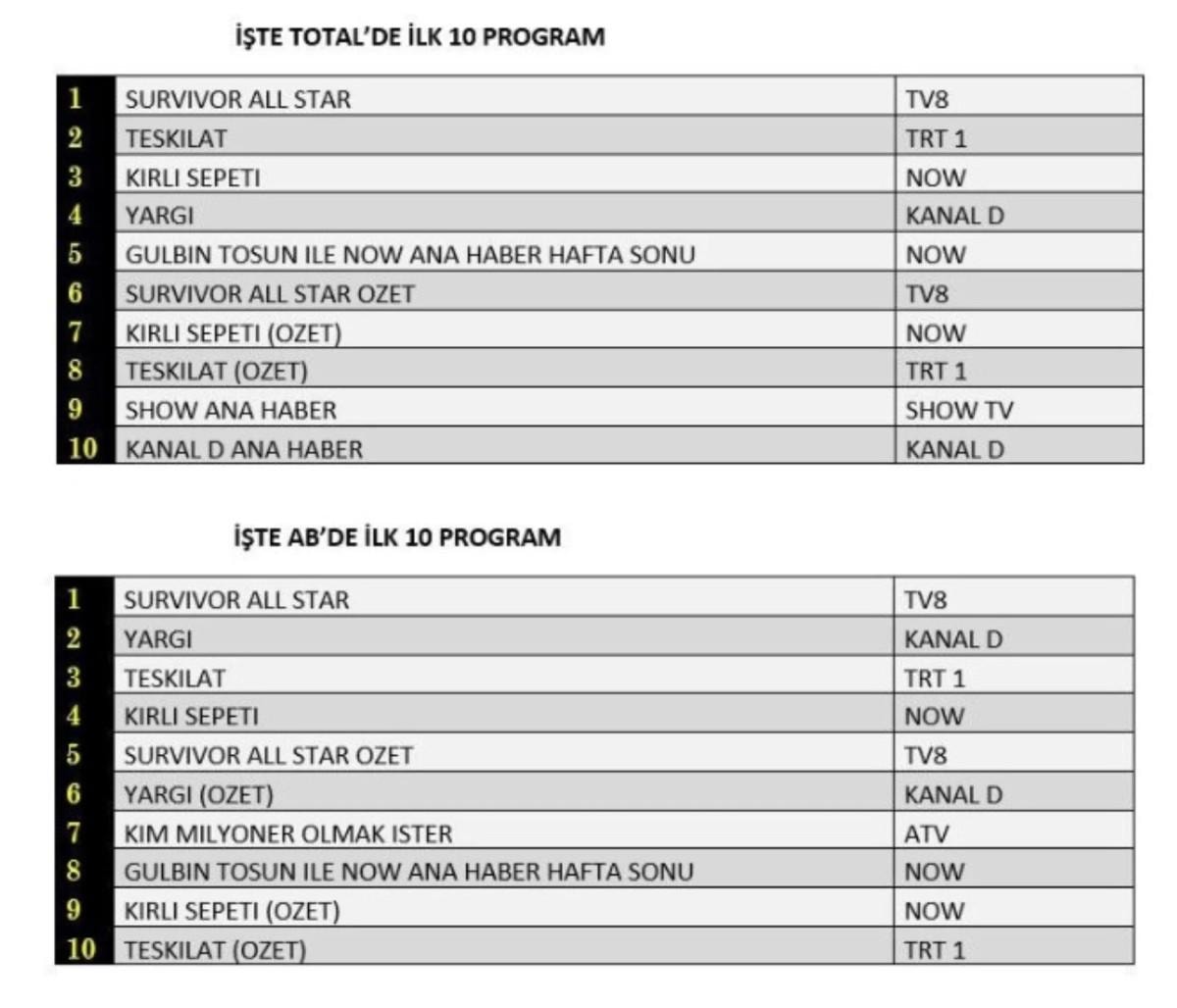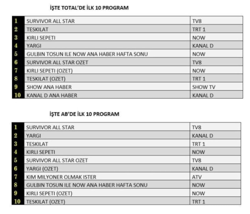 Total'de reyting listesinin ilk sırasında Survivor All Star, ikinci sırada Teşkilat, üçüncü sırada Kirli Sepeti yer aldı.