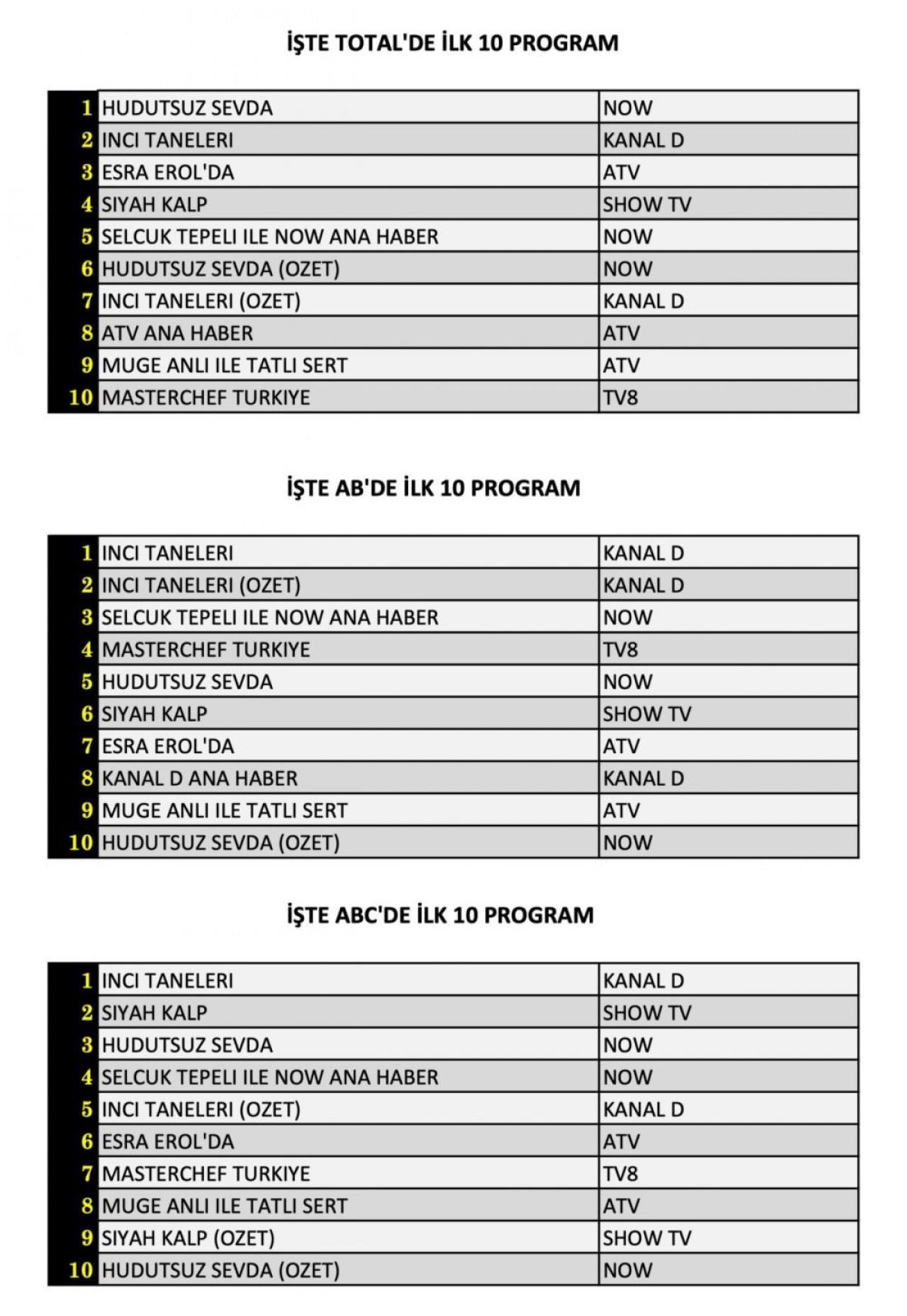 Her gün bir önceki güne ait Total, AB ve ABC sıralaması belli olurken dünün reyting sonuçları merakla bekleniyor.
