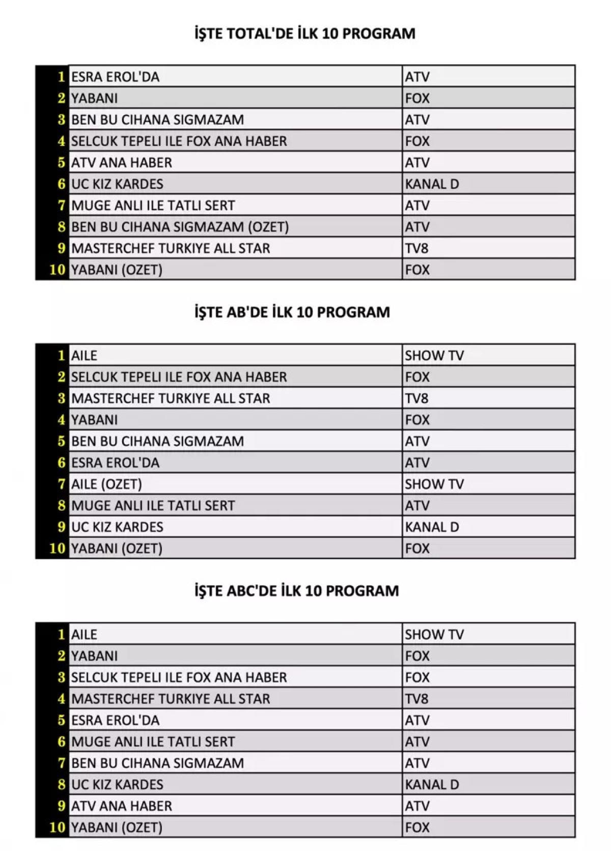 Her gün bir önceki güne ait Total, AB ve ABC sıralaması belli olurken dünün reyting sonuçları merakla bekleniyor.