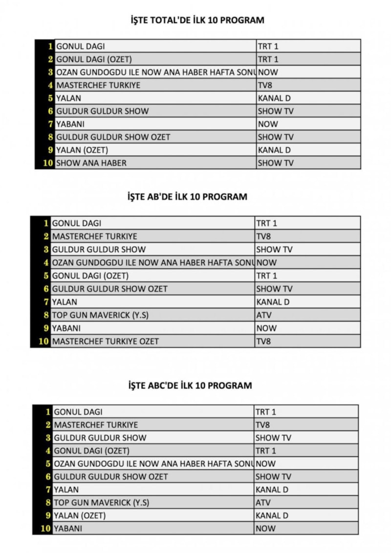 Total’de 1. sırada TRT 1’de izleyici ile buluşan “Gönül Dağı”, 2. sırada “Gönül Dağı” özet bölümü, 3. sırada ise “Ozan Gündoğdu ile NOW Ana Haber Hafta Sonu” yer aldı.
