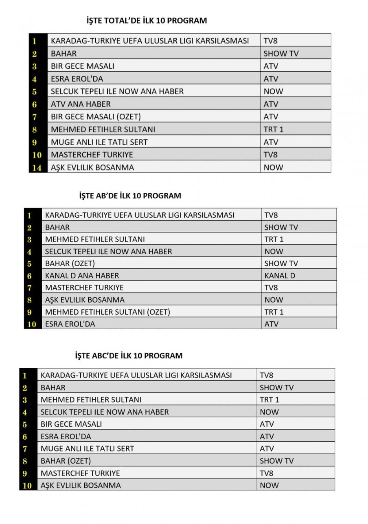 AB ve ABC kategorisinde 1. sırada Karadağ-Türkiye UEFA Uluslar Ligi Karşılaşması, 2. sırada Bahar dizisi, 3 sırada ise TRT 1'de yayınlanan Mehmed Fetihler Sultanı dizisi yer aldı.