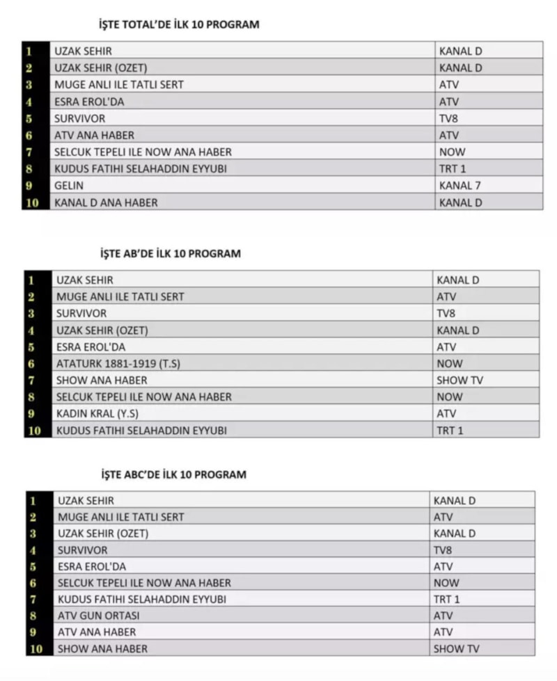 Her gün bir önceki güne ait Total, AB ve ABC sıralaması belli olurken dünün reyting sonuçları merakla bekleniyor.