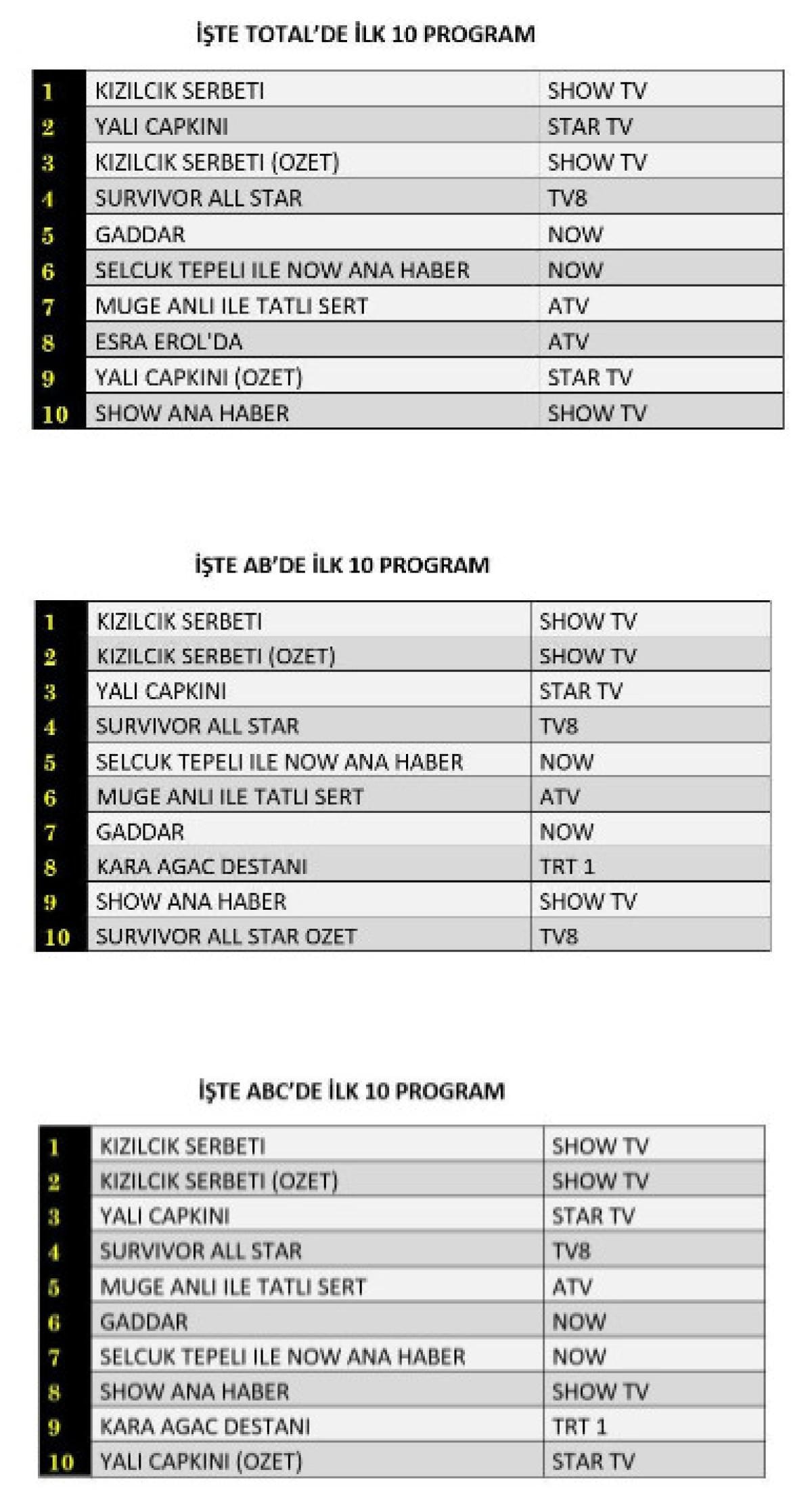 Her gün bir önceki güne ait Total, AB ve ABC sıralaması belli olurken dünün reyting sonuçları merakla bekleniyor.