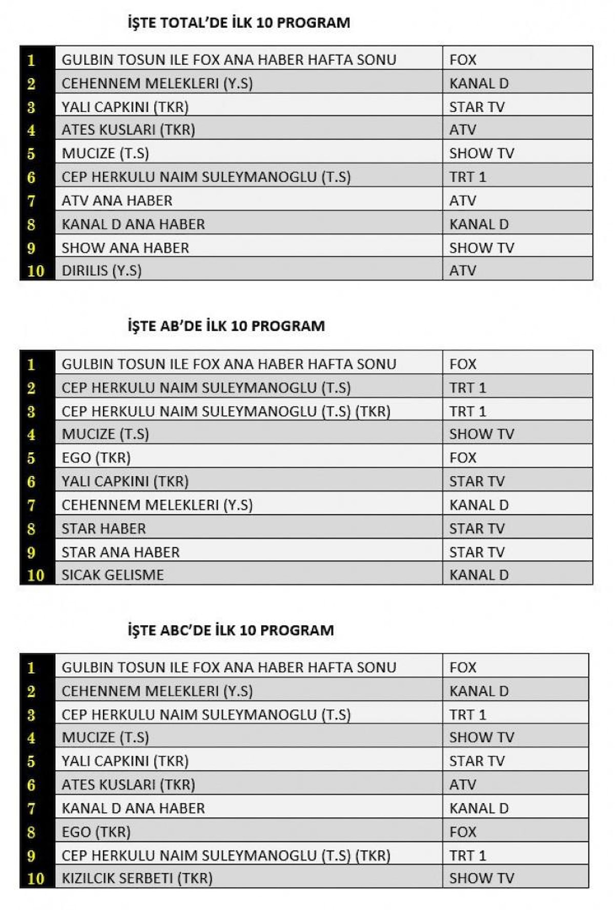 AB'de ise birinci sırada Gülbin Tosun ile FOX Ana Haber Hafta Sonu, ikinci sırada Cep Herkülü Naim Süleymanoğlu, üçüncü sırada Cep Herkülü Naim Süleymanoğlu tekrarı yer aldı.