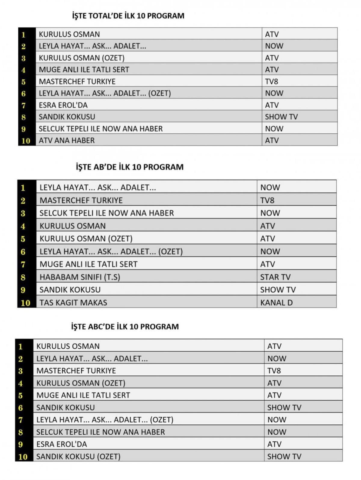 Total'de 1.sırada Atv’de izleyiciyle buluşan “Kuruluş Osman”, 2. sırada Now TV’de ekrana gelen “Leyla Hayat… Aşk… Adalet…”, 3.sırada “Kuruluş Osman” dizinin özeti yer aldı.