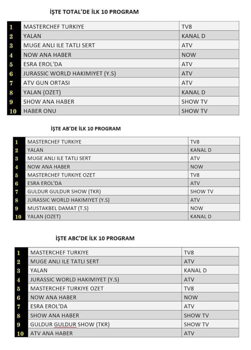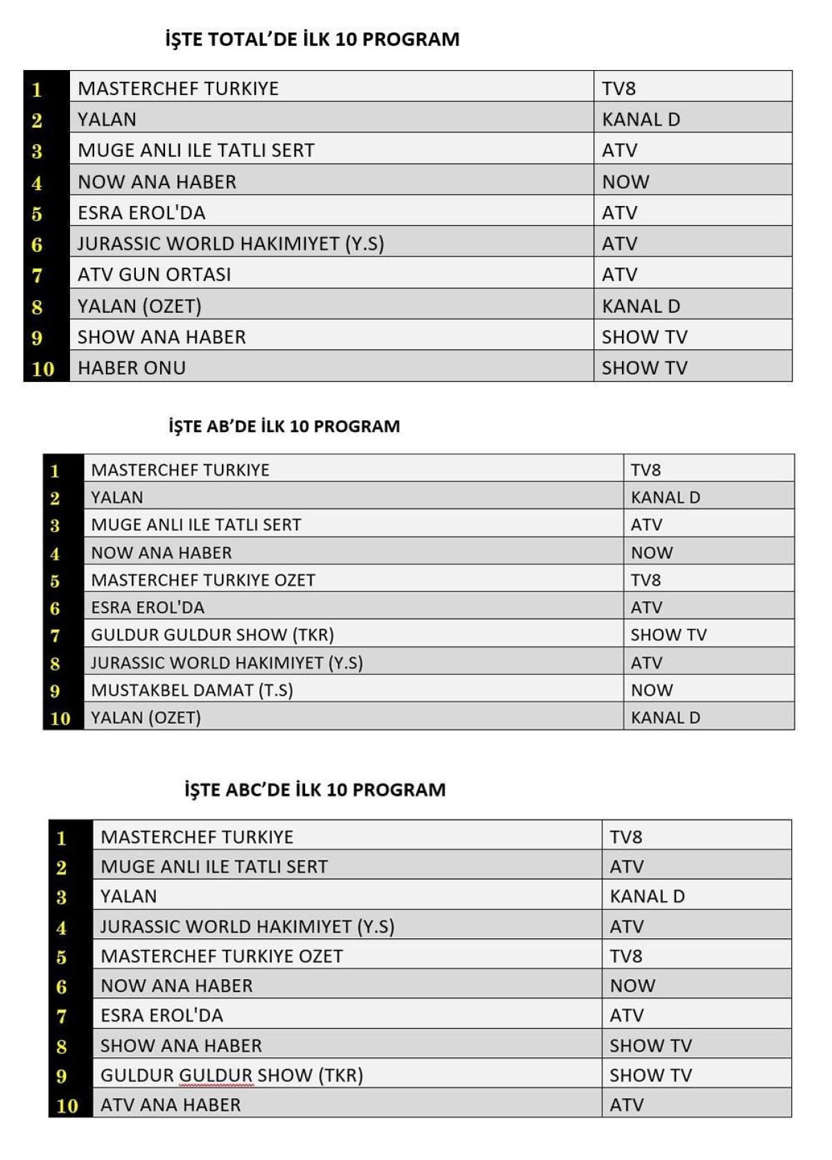 ABC'de ise 1.sırada “Masterchef Türkiye”, 2.sırada “Müge Anlı İle Tatlı Sert”, 3.sırada “Yalan” yer aldı.
