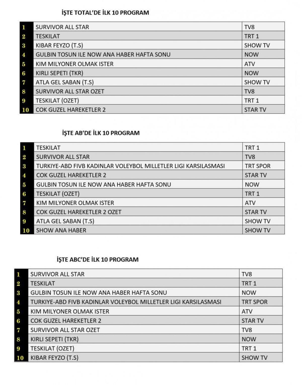 20+ABC1 grubunda ise birinci sırada Survivor All Star, ikinci sırada Teşkilat, üçüncü sırada Gülbin Tosun ile NOW Ana Haber yer aldı.