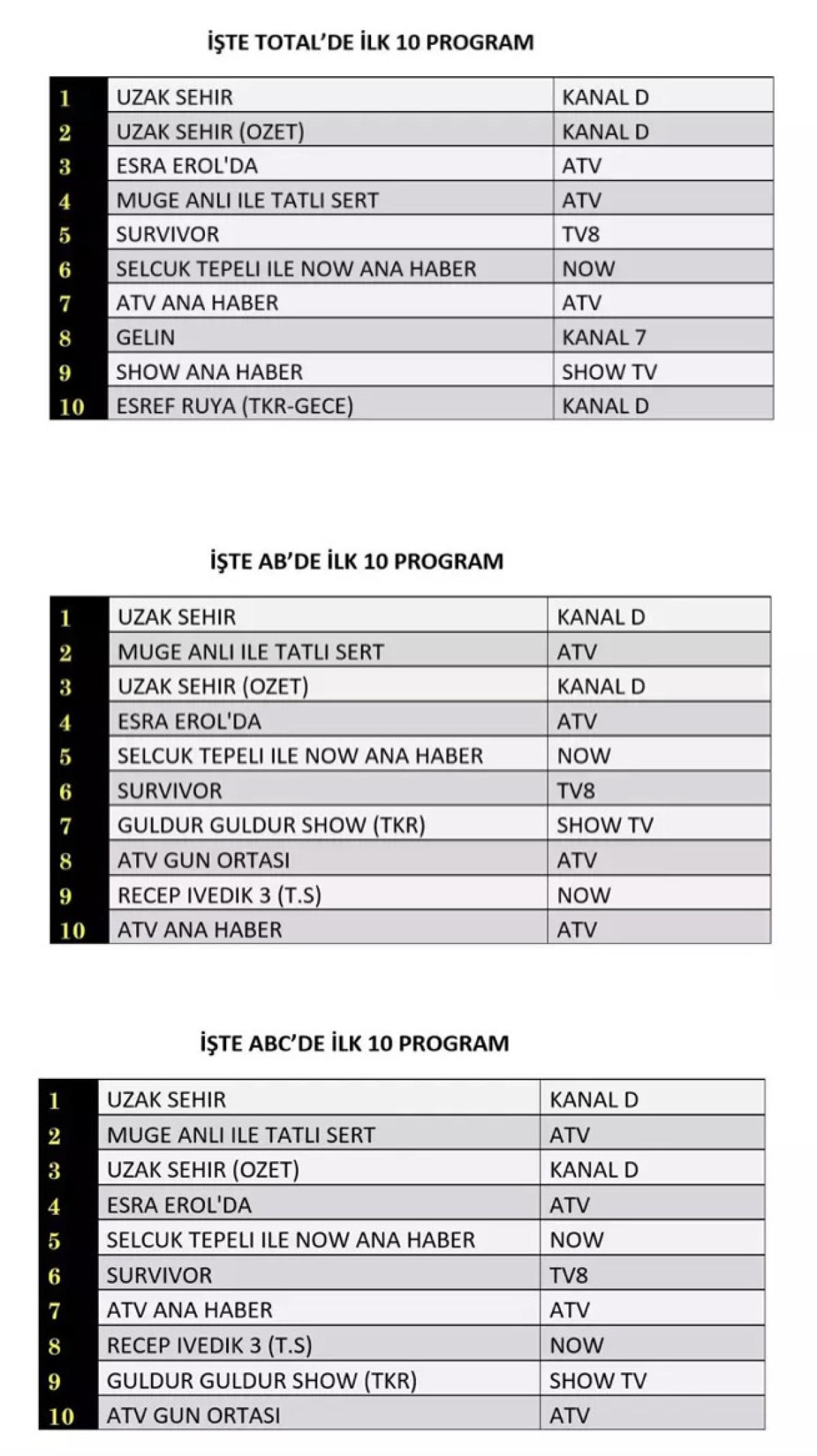 Her gün bir önceki güne ait Total, AB ve ABC sıralaması belli olurken dünün reyting sonuçları merakla bekleniyor.