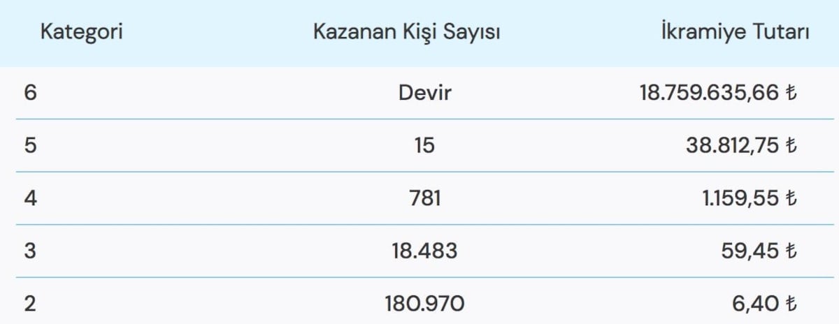 Büyük ikramiyenin 18.759.635,66 TL olduğu çekilişte 6 bilen çıkmadığı için büyük ikramiye devretti.