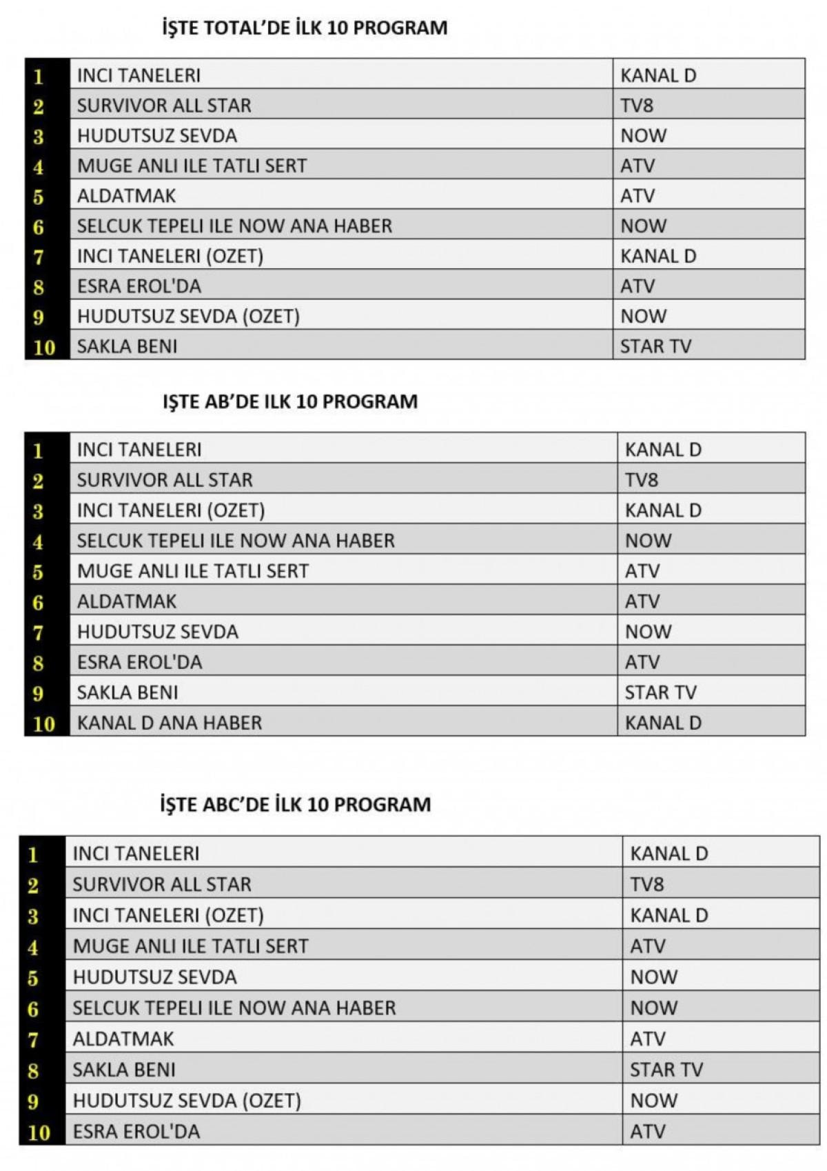 Total'de reyting listesinin ilk sırasında İnci Taneleri, ikinci sırada Survivor All Star, üçüncü sırada Hudutsuz Sevda yer aldı.