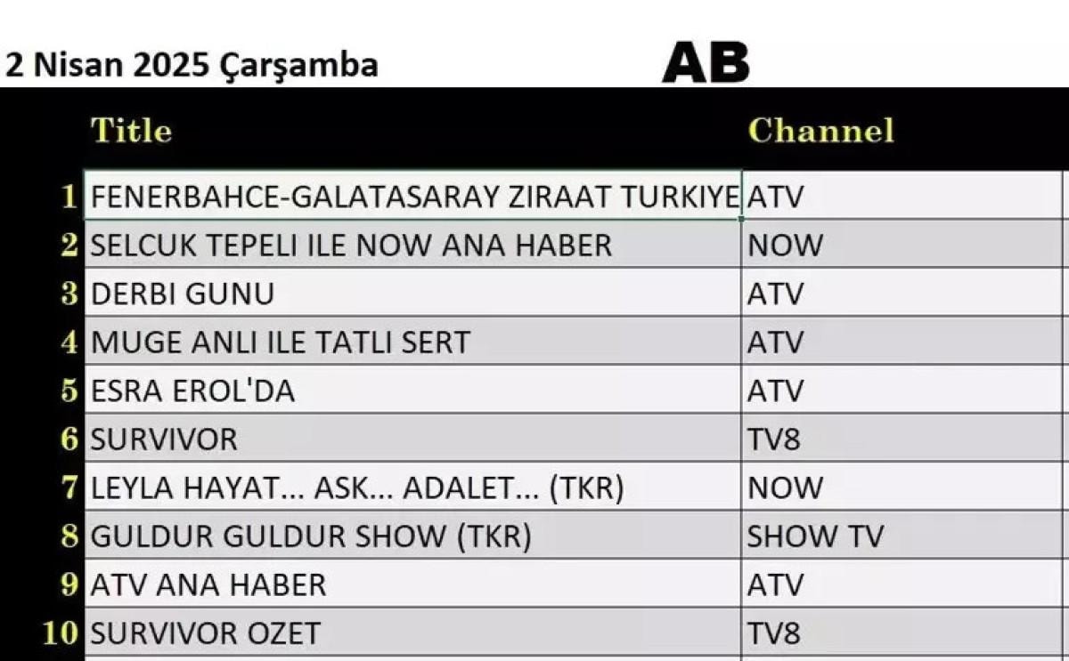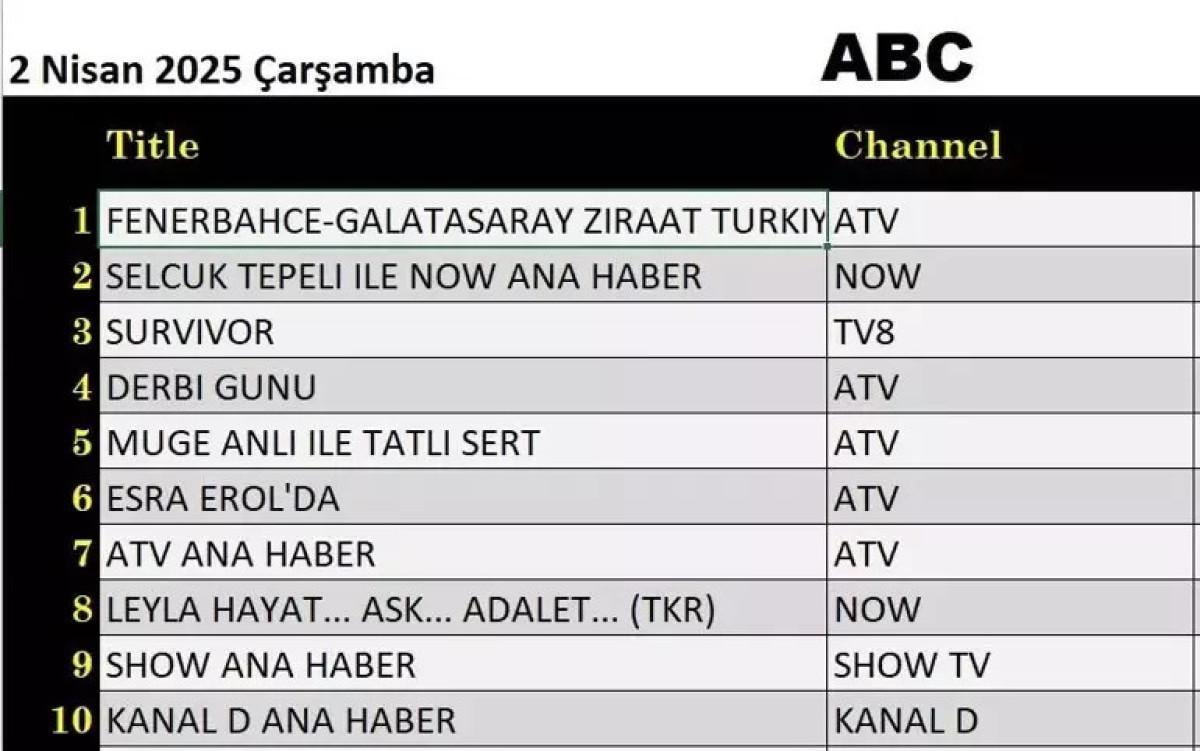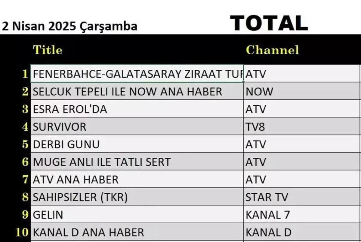 2 NİSAN ÇARŞAMBA REYTİNG SONUÇLARI