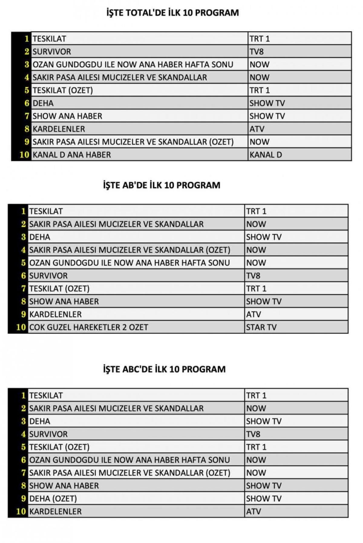 ABC’de 1. sırada “Teşkilat” yer aldı. ABC’de 2. sırada “Şakir Paşa Ailesi: Mucizeler ve Skandallar” yer aldı. ABC 3. sırada ise “Deha” yer aldı.