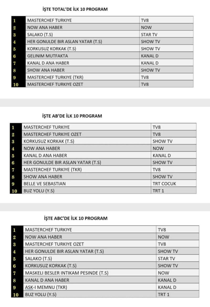 Her gün bir önceki güne ait Total, AB ve ABC sıralaması belli olurken dünün reyting sonuçları merakla bekleniyor.