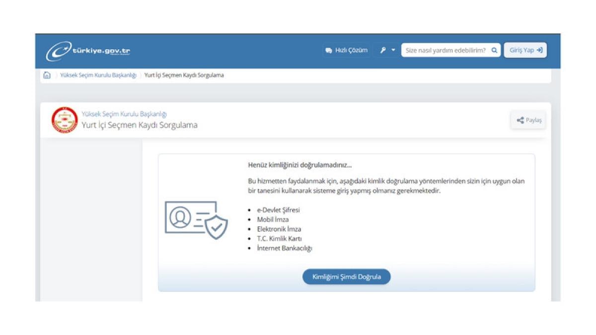 Seçmen bilgi kağıdına ulaşmak isteyenler, e-Devlet üzerinden giriş yaparak öğrenebiliyor. Yurt İçi Seçmen Kaydı Sorgulama ekranı ile, sandık bilgilerine ulaşabiliyor.