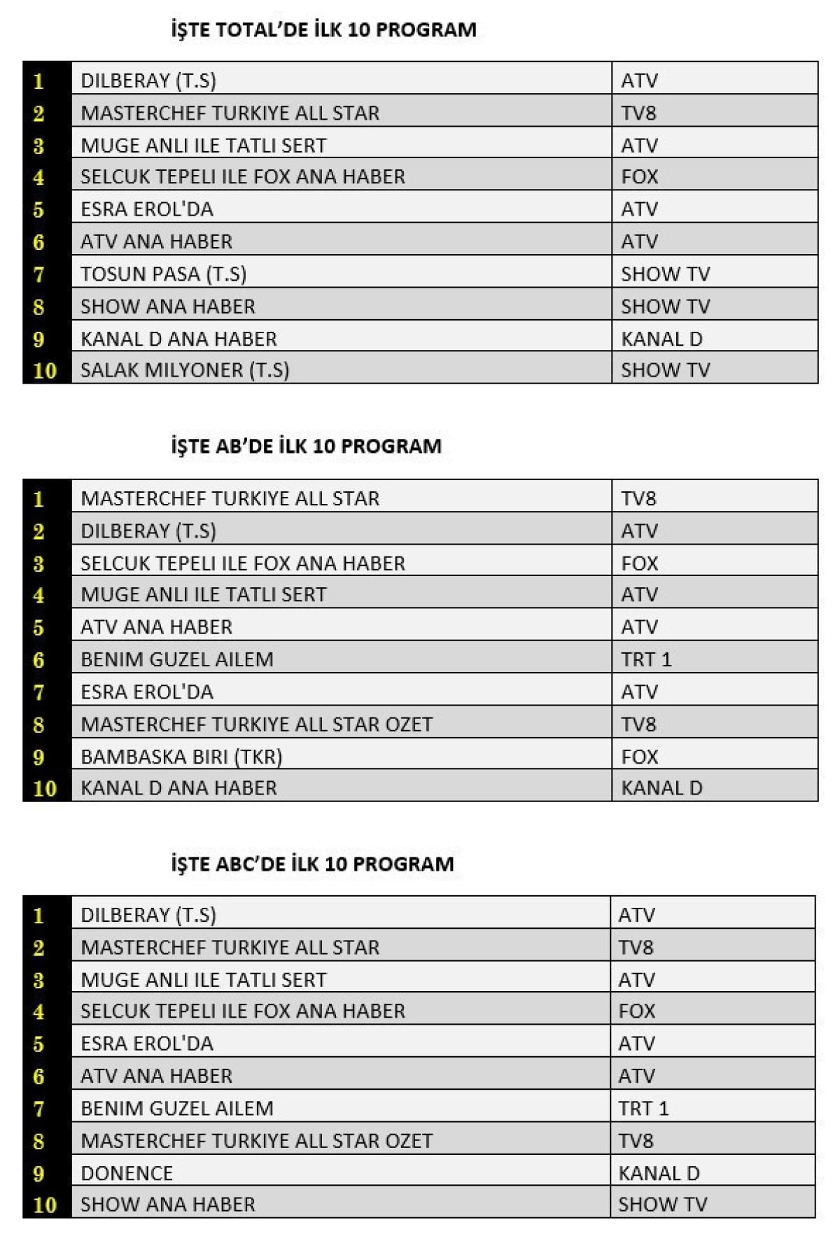 Total'de 1.sırada Atv’de izleyiciyle buluşan Türk Sineması “Dilberay”, 2. sırada TV8’de yayınlanan “Masterchef Türkiye All Star”, 3.sırada Atv’de ekrana gelen “Müge Anlı Tatlı Sert” yer aldı.