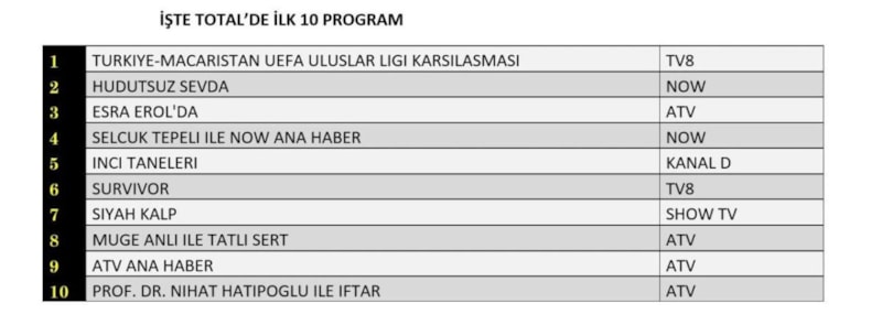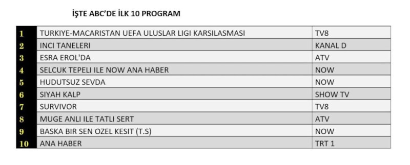 Her gün bir önceki güne ait Total, AB ve ABC sıralaması belli olurken dünün reyting sonuçları merakla bekleniyor.
