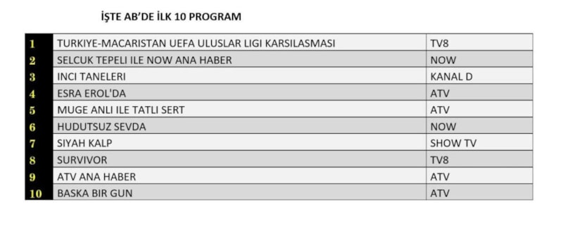 İkinci sırayı Hudutsuz Sevda kaptı. Üçüncü sırada ise gündüz kuşağı Esra Erol’da yer aldı.