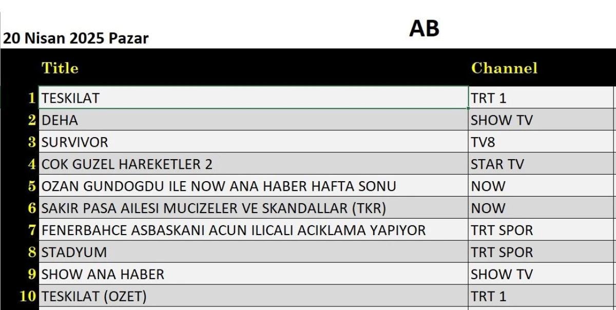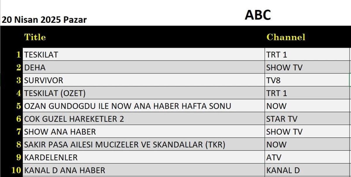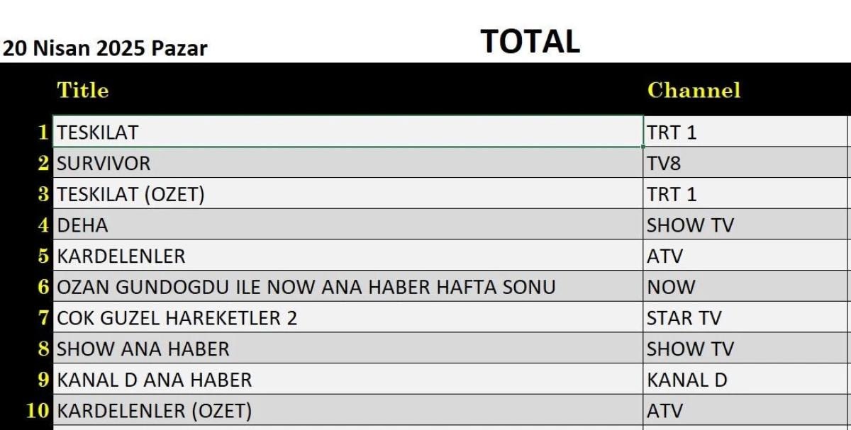 Her gün bir önceki güne ait Total, AB ve ABC sıralaması belli olurken dünün reyting sonuçları merakla bekleniyor.