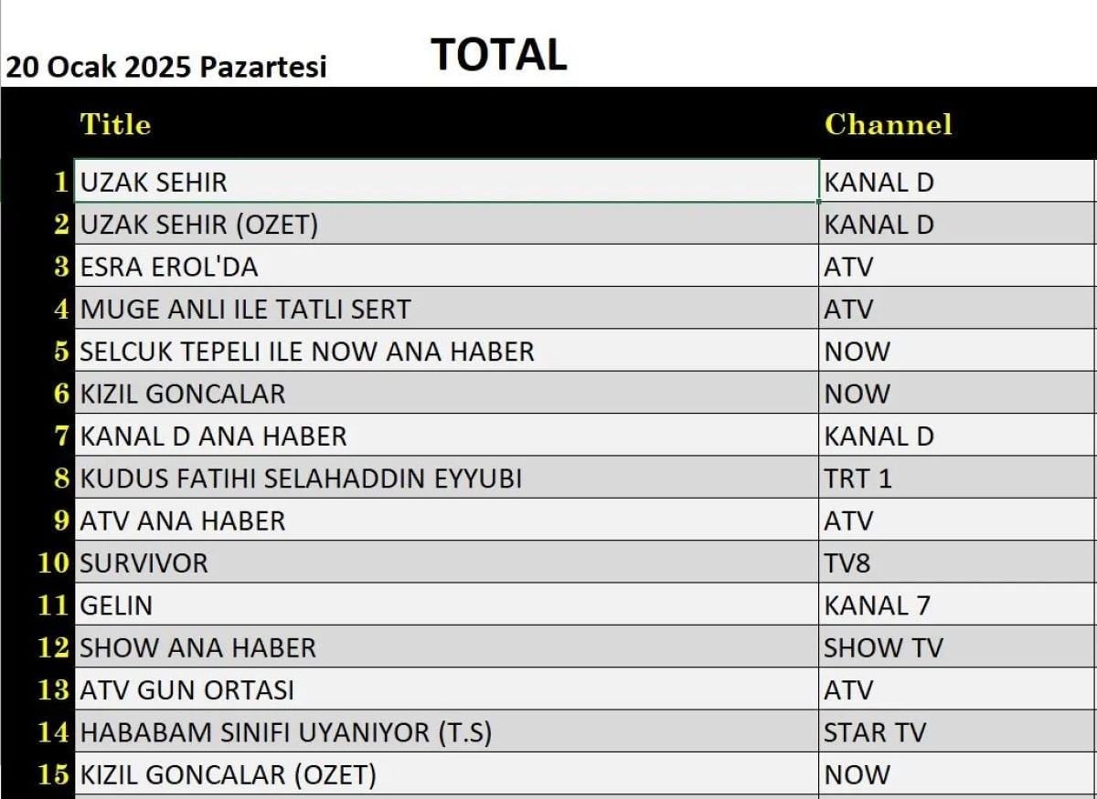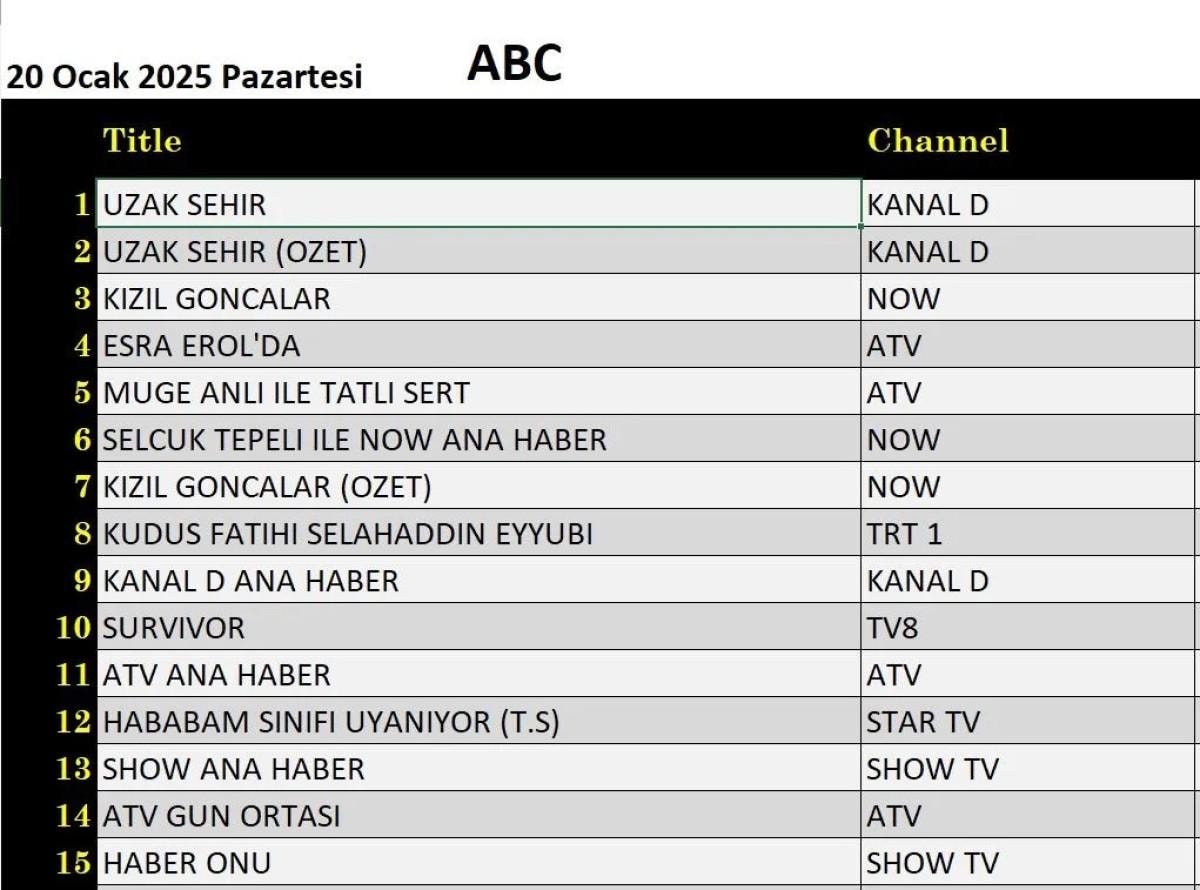 Her gün bir önceki güne ait Total, AB ve ABC sıralaması belli olurken dünün reyting sonuçları merakla bekleniyor.