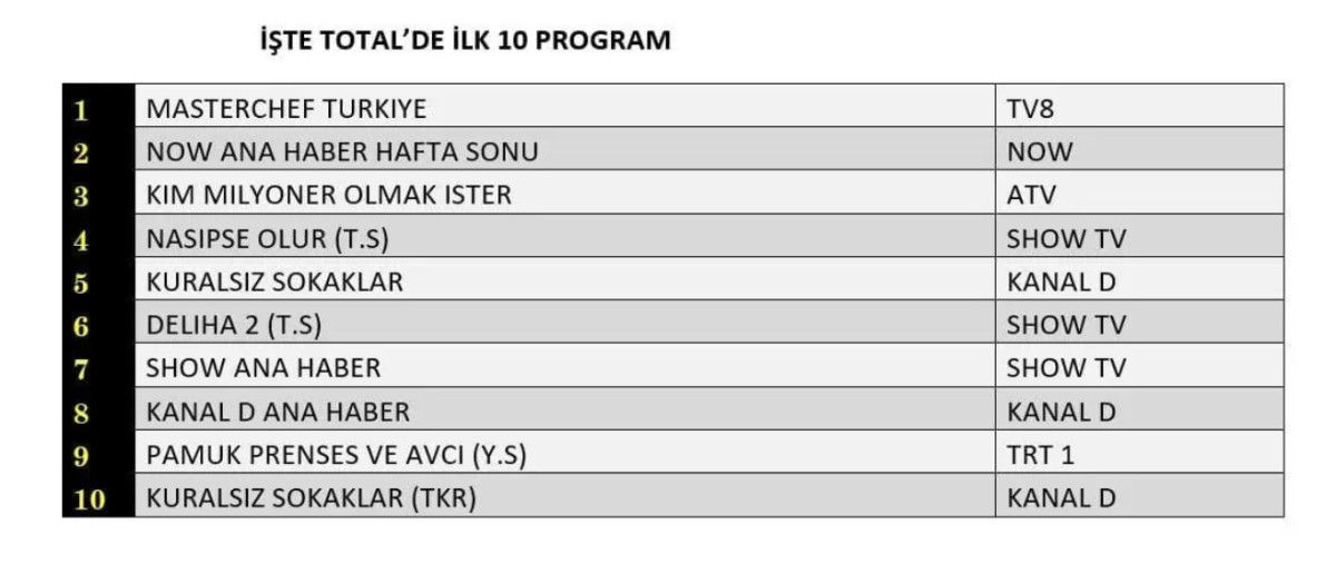 Total kategorisinde 1. sırada “Masterchef Türkiye”, 2. sırada “Now Ana Haber Hafta Sonu”, 3. sırada ise“Kim Milyoner Olmak İster” yer aldı.