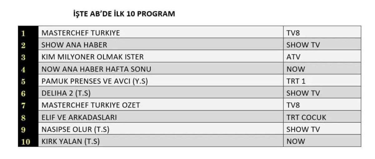 AB kategorisinde 1. sırada “Masterchef Türkiye”, 2. sırada “Show Ana Haber”, 3. sırada ise “Kim Milyoner Olmak İster” dizisi yer aldı.