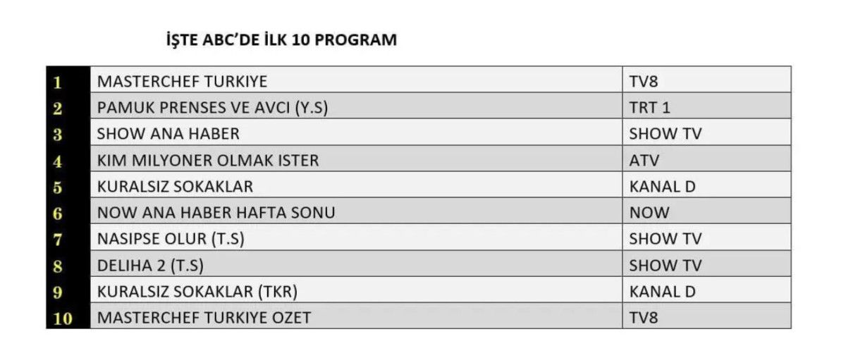 ABC kategorisinde 1. sırada “Masterchef Türkiye”, 2. sırada “Pamuk Prenses ve Avcı (Yabancı Sinema)”, 3. sırada “Show Ana Haber” yer aldı.
