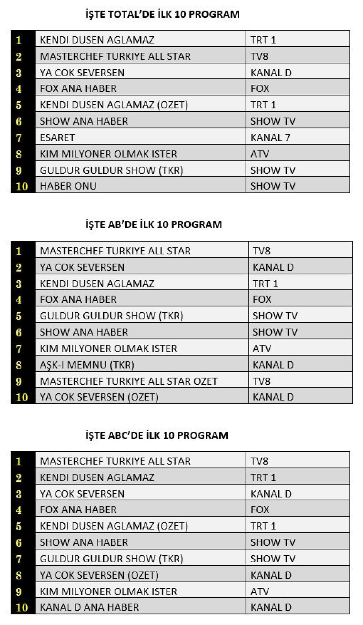 AB'de ise 1.sırada “Masterchef Türkiye All Star”, 2.sırada “Ya Çok Seversen”, 3.sırada “Kendi Düşen Ağlamaz” yer aldı.