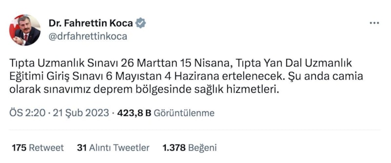 Fahrettin Koca açıklamasında "Tıpta Uzmanlık Sınavı 26 Marttan 15 Nisana, Tıpta Yan Dal Uzmanlık Eğitimi Giriş Sınavı 6 Mayıstan 4 Hazirana ertelenecek. Şu anda camia olarak sınavımız deprem bölgesinde sağlık hizmetleri." ifadelerine yer verdi.