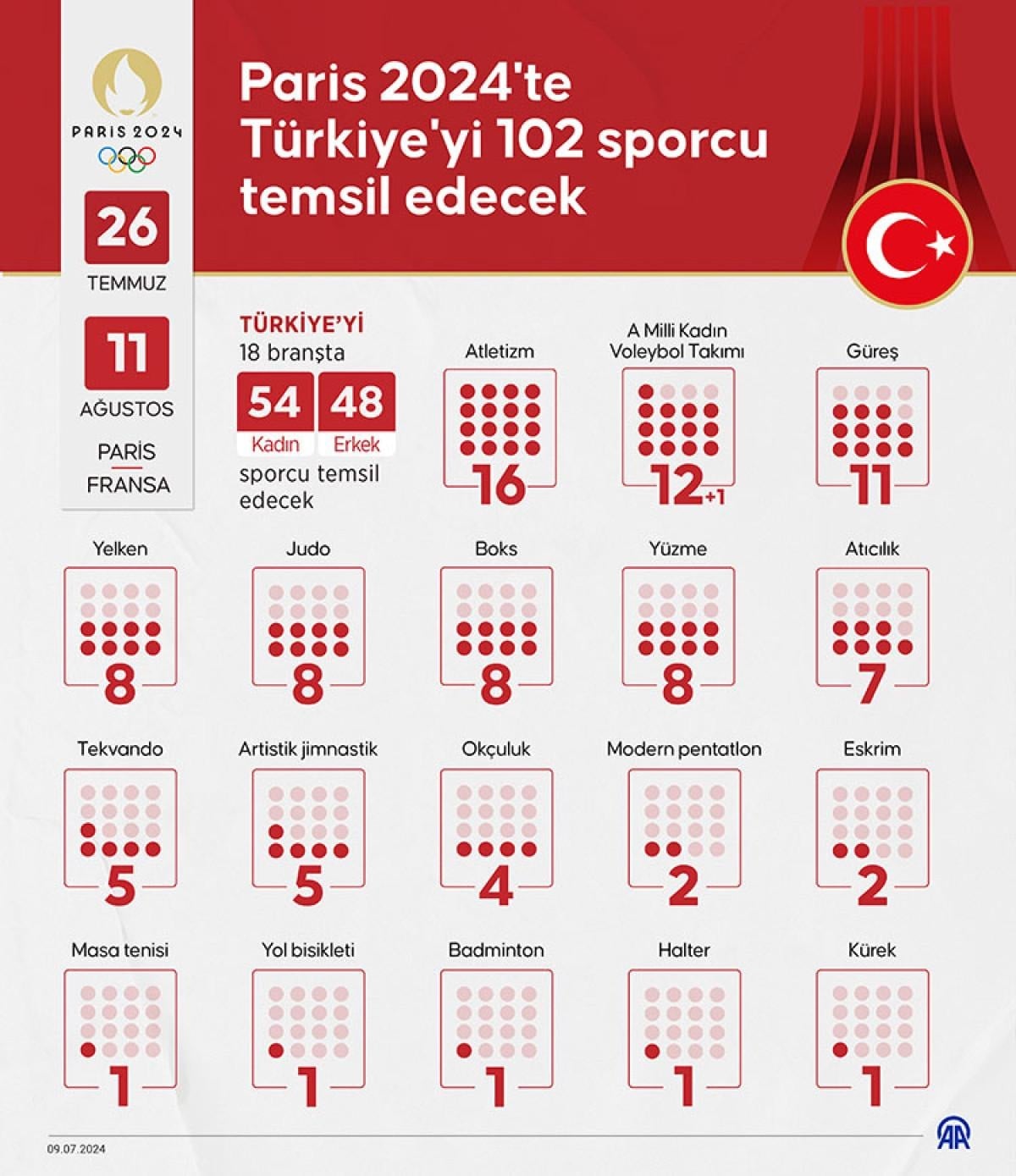 Türkiye Milli Olimpiyat Komitesinin internet sitesinde yayımlanan Paris 2024'e kota kazanan sporcular listesinin güncellenmiş haline göre, oyunlarda 54 kadın ve 48 erkek sporcu, Türkiye'yi 18 spor dalında temsil edecek.