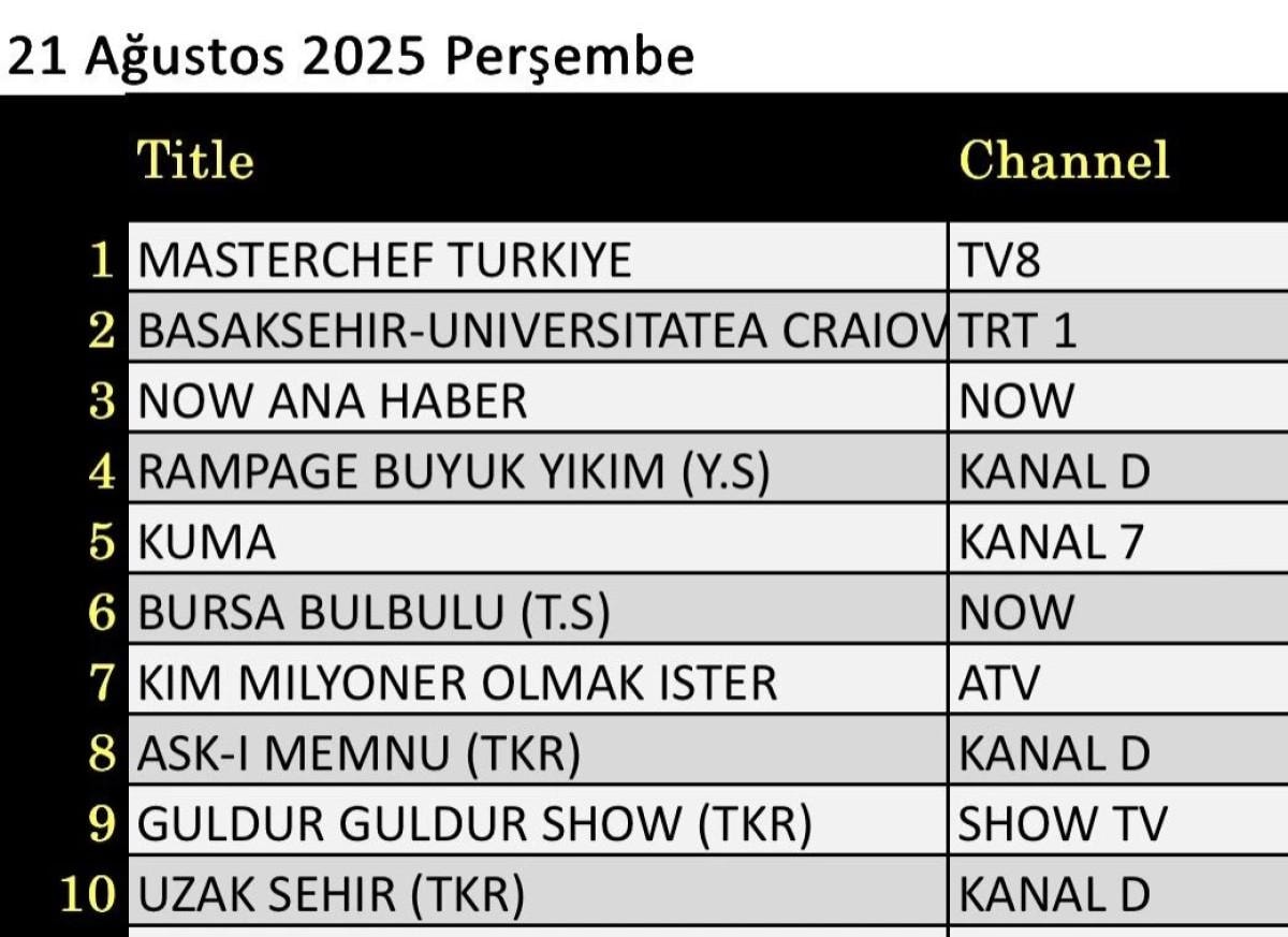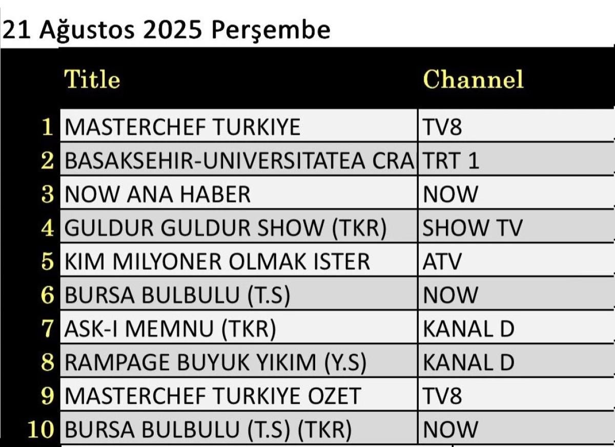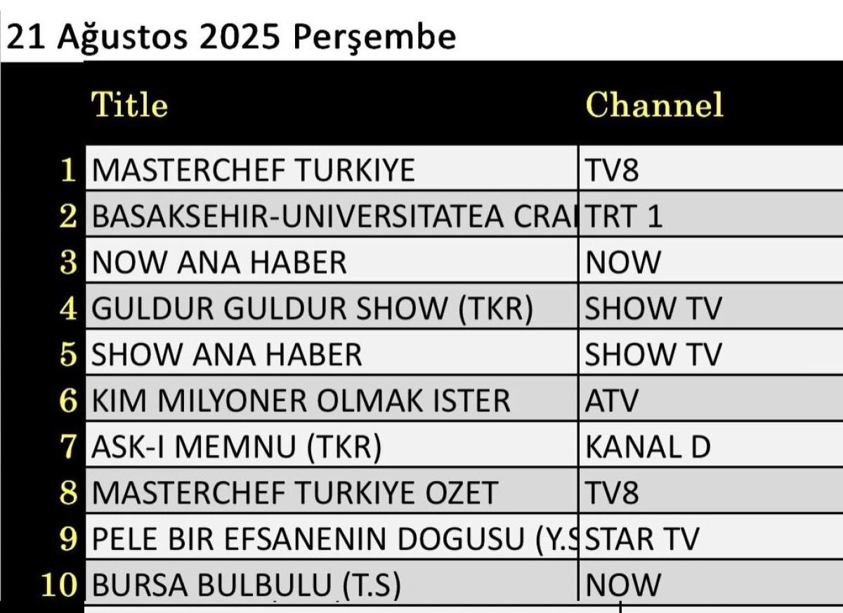 21 AĞUSTOS PERŞEMBE REYTİNG SONUÇLARI
