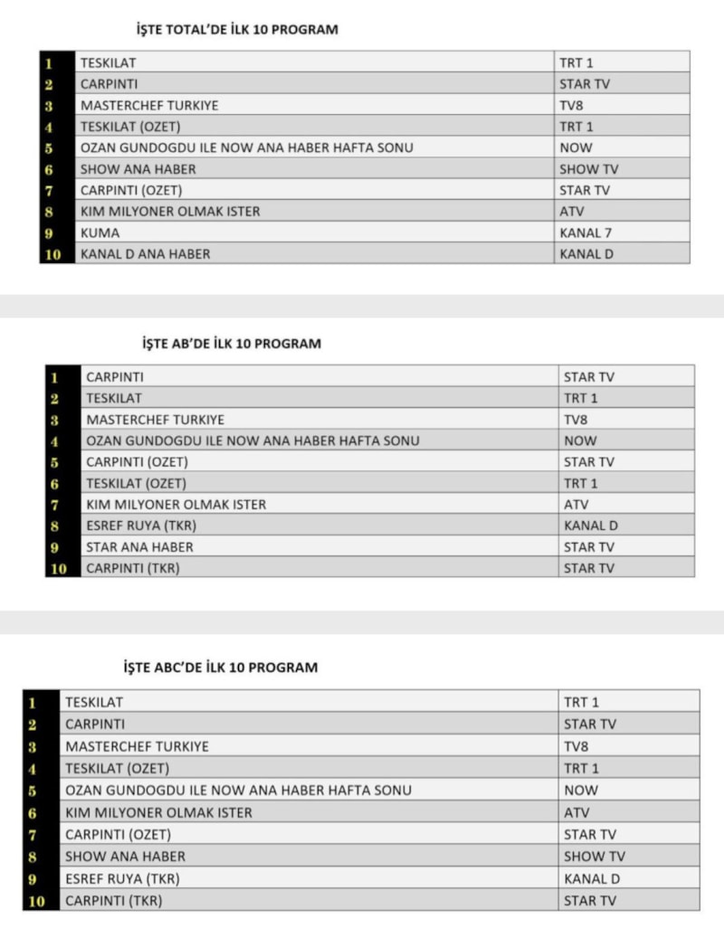 Her gün bir önceki güne ait Total, AB ve ABC sıralaması belli olurken dünün reyting sonuçları merakla bekleniyor.