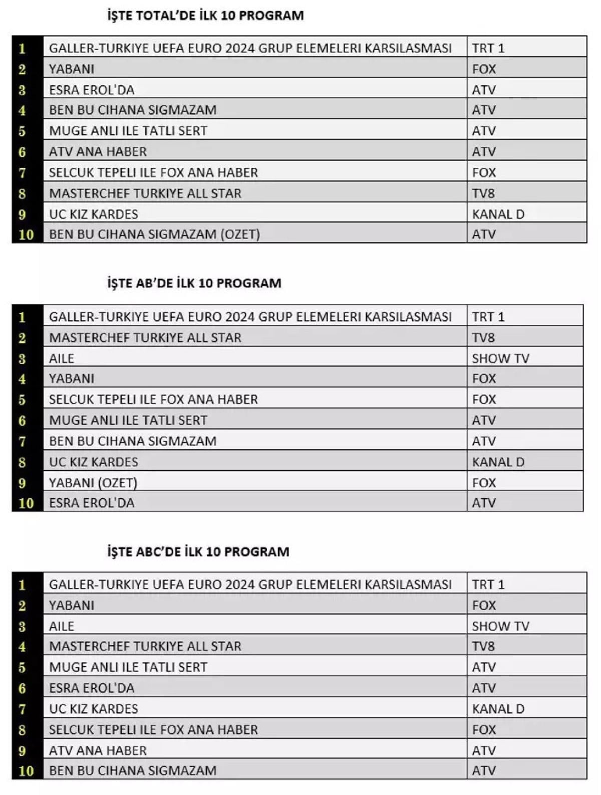 AB'de ise birinci sırada Galler Türkiye UEFA EURO 2024 Grup Elemeleri Karşılaşması, ikinci sırada Masterchef Türkiye All Star, üçüncü sırada Aile yer aldı.