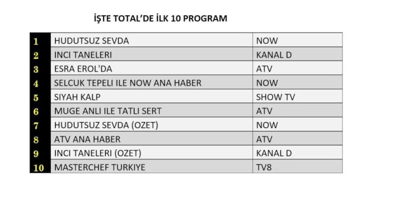 Total'de 1.sırada Now TV’de izleyiciyle buluşan “Hudutsuz Sevda”, 2. sırada Kanal D’de ekrana gelen “İnci Taneleri”, 3.sırada Atv’de yayınlanan “Esra Erol’da” yer aldı.