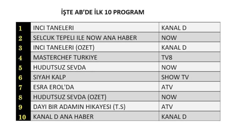 AB'de 1.sırada “İnci Taneleri”, 2.sırada “Selçuk Tepeli İle Fox Ana Haber”, 3.sırada “İnci Taneleri” dizisinin özeti yer aldı.
