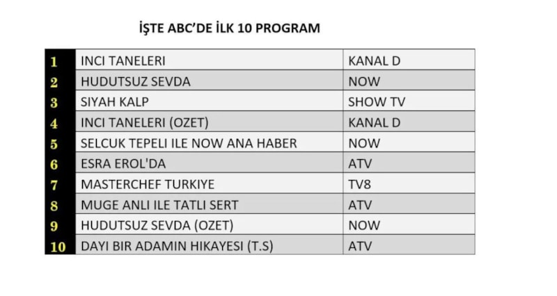 ABC'de ise 1.sırada “İnci Taneleri”, 2.sırada “Hudutsuz Sevda”, 3.sırada Show TV’de ekrana gelen “Siyah Kalp” yer aldı.