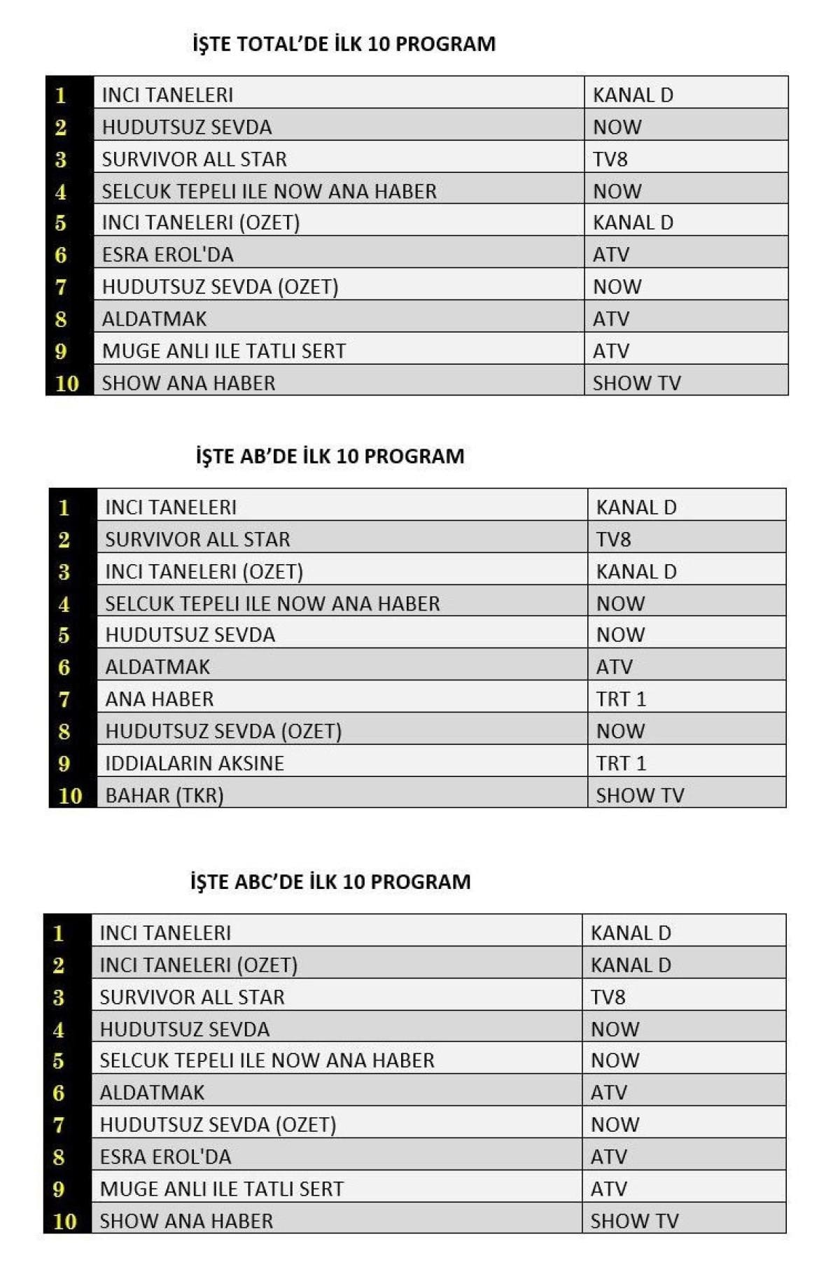 Her gün bir önceki güne ait Total, AB ve ABC sıralaması belli olurken dünün reyting sonuçları merakla bekleniyor.
