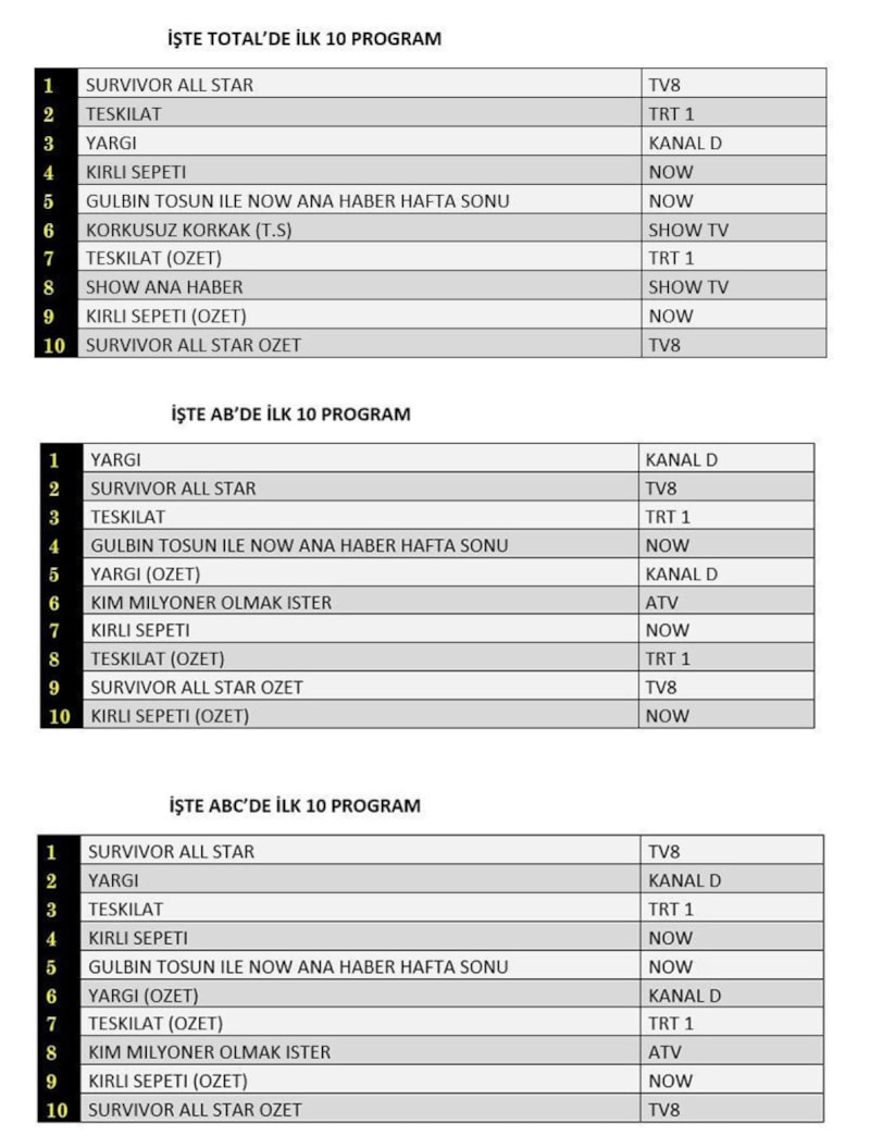 ABC'de ise 1.sırada “Yargı”, 2.sırada “Survivor All Star”, 3.sırada “Teşkilat” yer aldı.