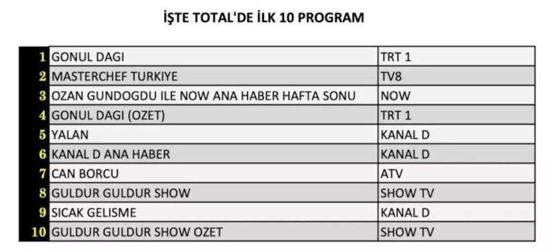 Total’de 1. sırada TRT 1’de izleyici ile buluşan “Gönül Dağı” yer aldı. 2. sırada tv8’de ekranlara gelen “MasterChef Türkiye” yer aldı. 3. sırada ise “Ozan Gündoğdu ile NOW Ana Haber Hafta Sonu” yer aldı.