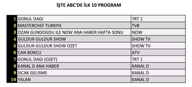 ABC’de 1. sırada “Gönül Dağı” yer aldı. 2. sırada “MasterChef Türkiye” yer aldı. 3. sırada ise “Ozan Gündoğdu ile NOW Ana Haber Hafta Sonu” yer aldı.