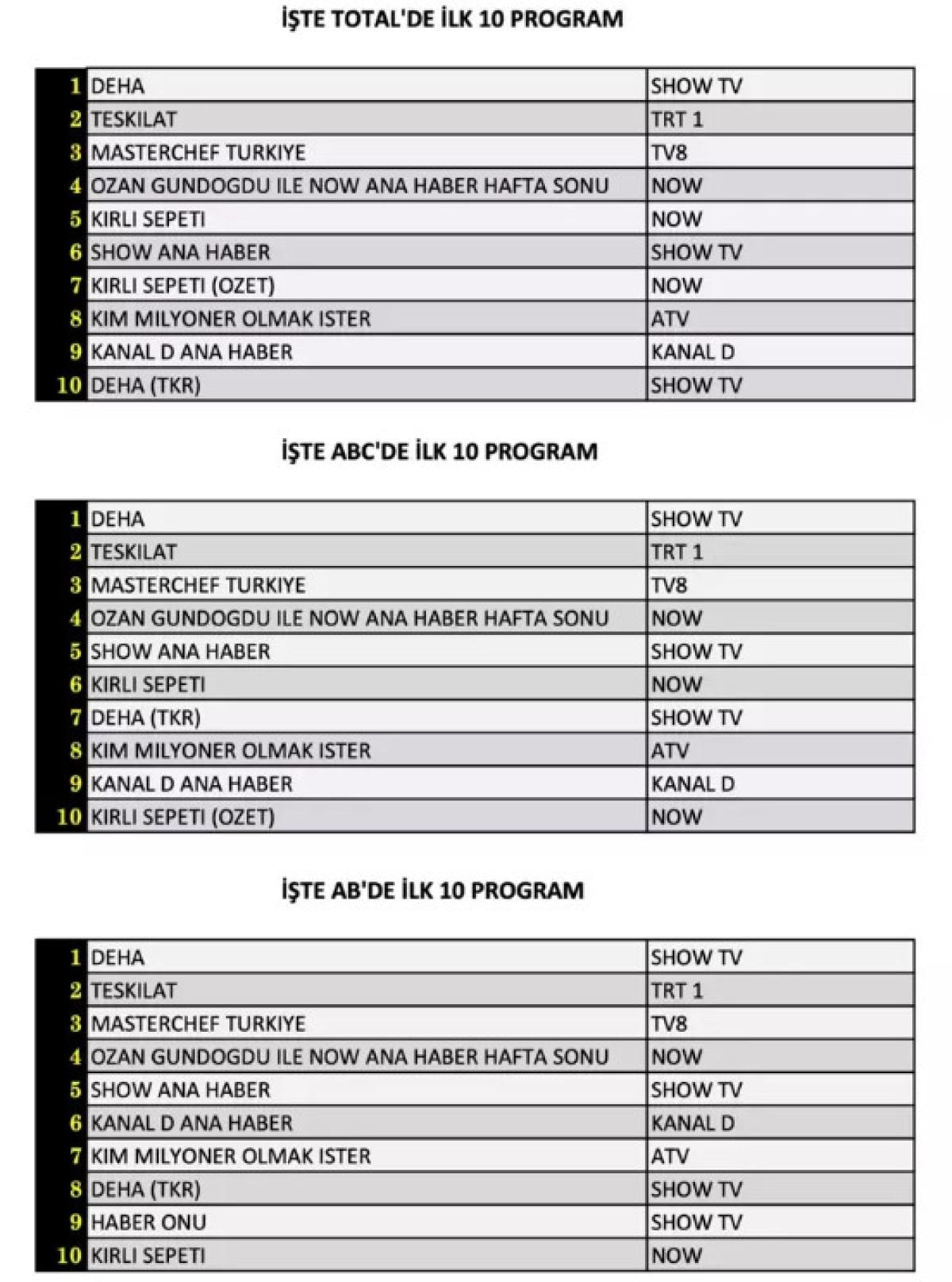 Her gün bir önceki güne ait Total, AB ve ABC sıralaması belli olurken dünün reyting sonuçları merakla bekleniyor.