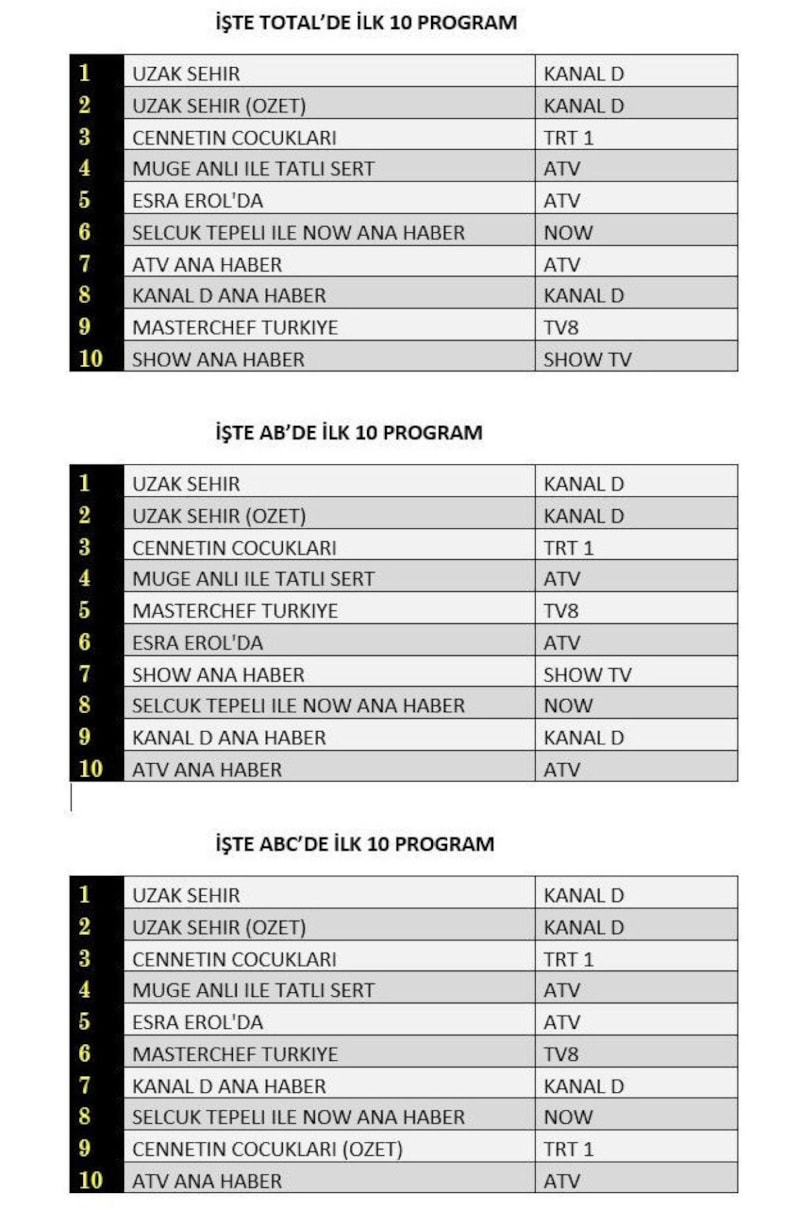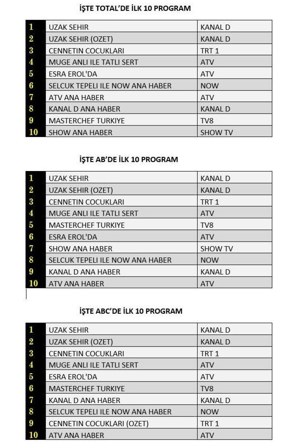 Her gün bir önceki güne ait Total, AB ve ABC sıralaması belli olurken dünün reyting sonuçları merakla bekleniyor.