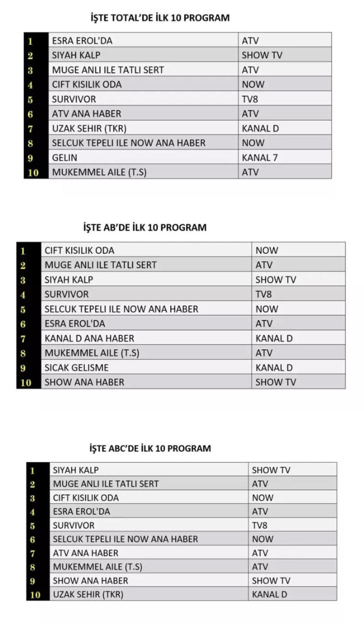 Her gün bir önceki güne ait Total, AB ve ABC sıralaması belli olurken dünün reyting sonuçları merakla bekleniyor.