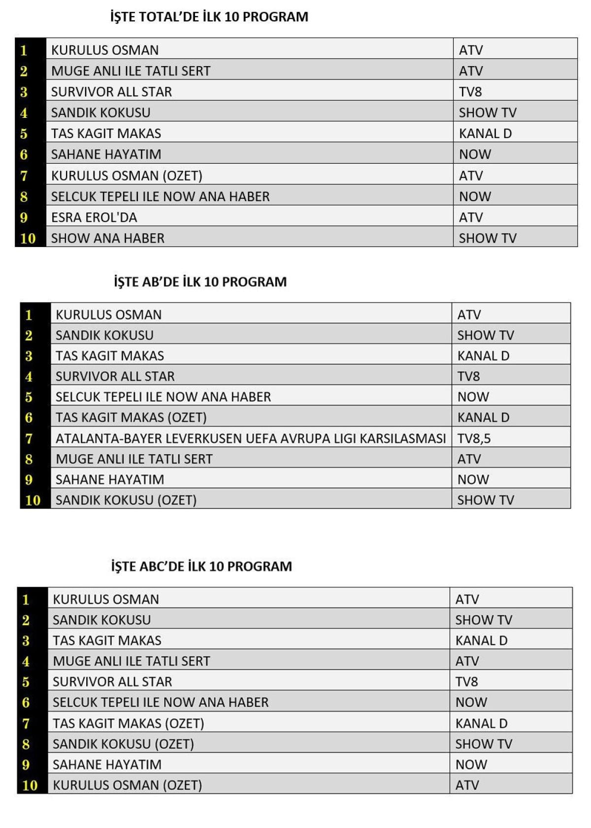 Total'de reyting listesinin ilk sırasında Kuruluş Osman, ikinci sırada Müge Anlı ile Tatlı Sert, üçüncü sırada Survivor All Star yer aldı.